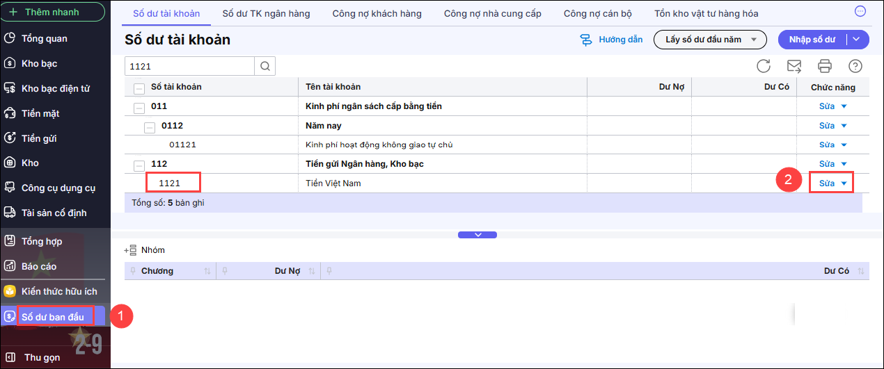 Bước 1: Vào menu Số dư ban đầu ( hoặc Biểu tượng Bánh răng ⚙ (góc phải phía trên)\ Thiết lâp\ Nhập số dư ban đầu)\ Tìm tài khoản 1121, 1122 \Bấm Sửa