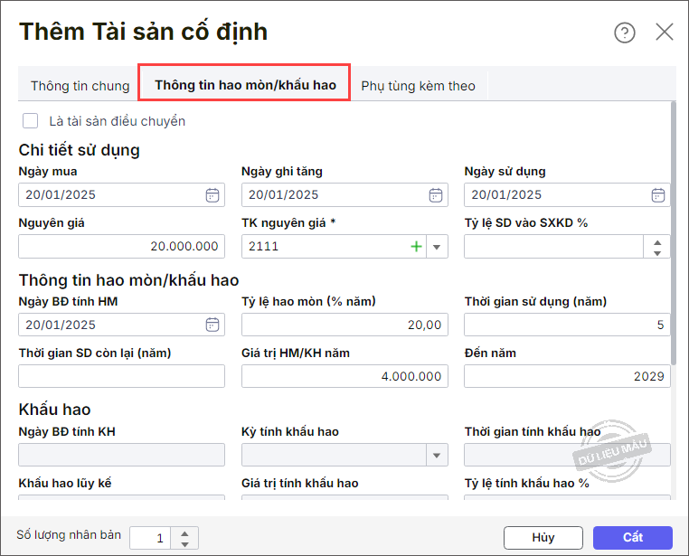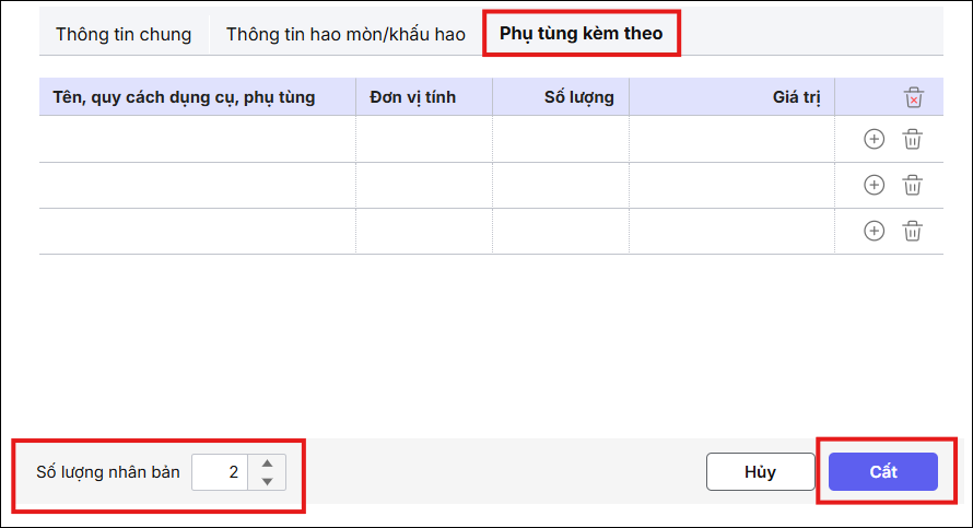 Lưu ý: Nếu muốn thêm nhiều tài sản giống nhau, nhập số lượng tại ô Số lượng nhân bản.