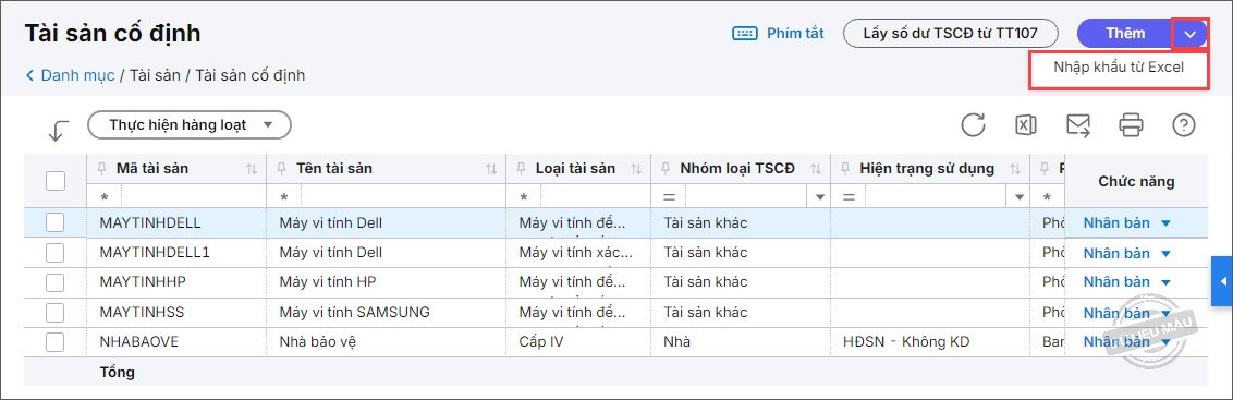 • Có thể nhập khẩu nhanh danh sách tài sản cố định bằng cách nhấn vào dấu mũi tên  bên cạnh chữ Thêm, chọn Nhập khẩu từ excel để nhập khẩu dữ liệu vào phần mềm. Thao tác chi tiết tham khảo tại đây.