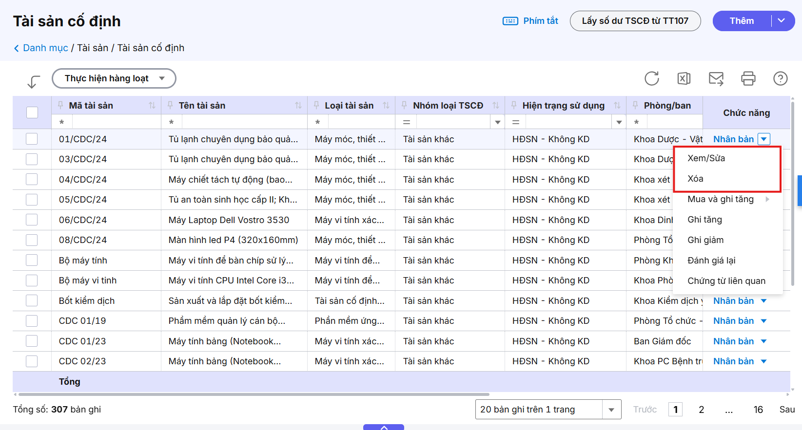 Bước 2: Chọn vào biểu tượng mũi tên ⏷ ở dòng tài sản cố định cần thay đổi và chọn chức năng Xem/ Sửa.