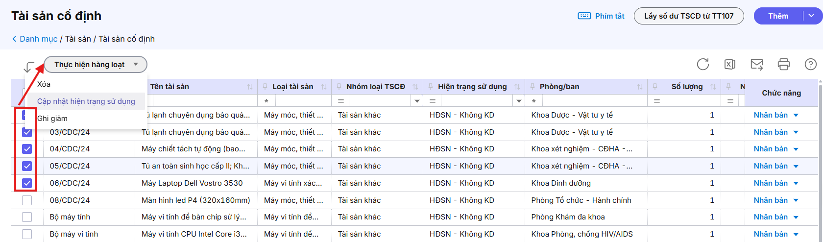 Bước 1: Tích chọn các TSCĐ cần cập nhật.
