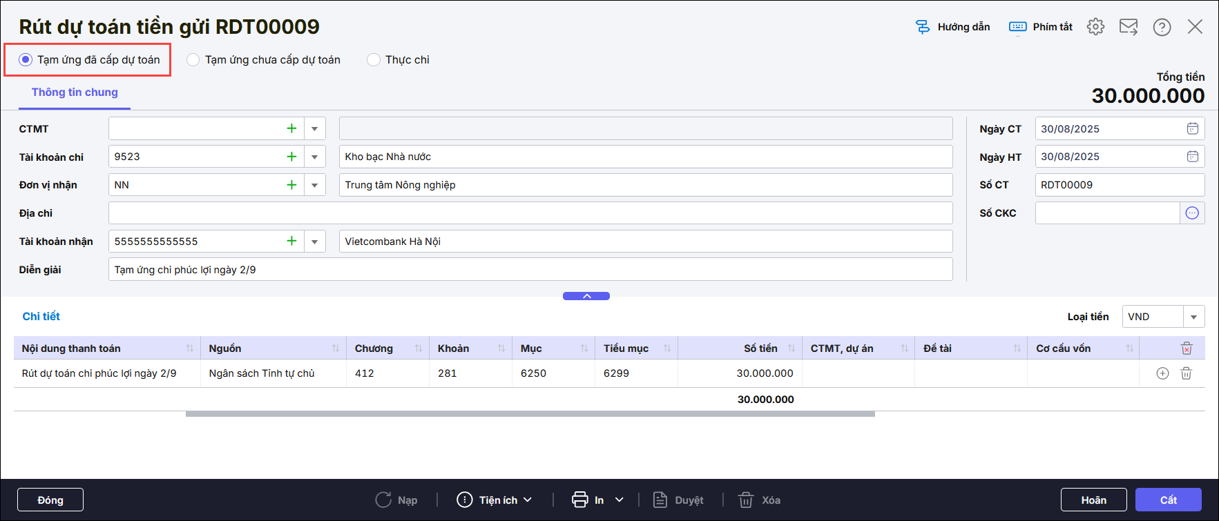- Chọn nghiệp vụ Tạm ứng đã cấp dự toán.