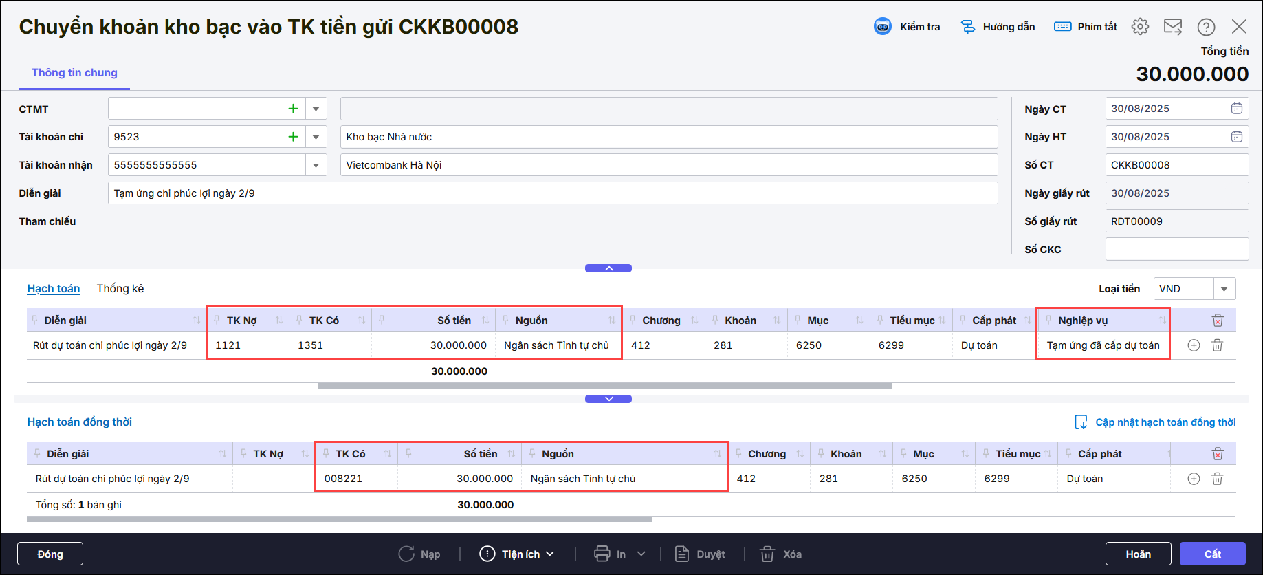 4. Bạn các thông tin trên chứng từ Chuyển khoản kho bạc vào TK tiền gửi, phần mềm đã tự sinh hạch toán TK Nợ 1121, TK Có 1351 – nghiệp vụ Tạm ứng đã cấp dự toán dựa theo tính chất nguồn KP đồng thời Có TK 008221 tương ứng.