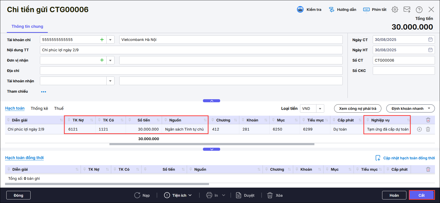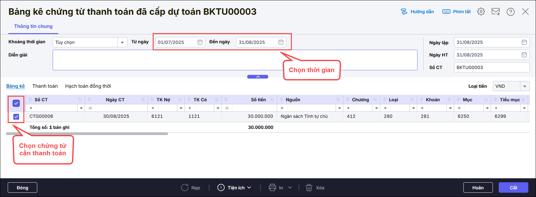 Lưu ý: Nghiệp vụ tích chọn Tạm ứng đã cấp dự toán.