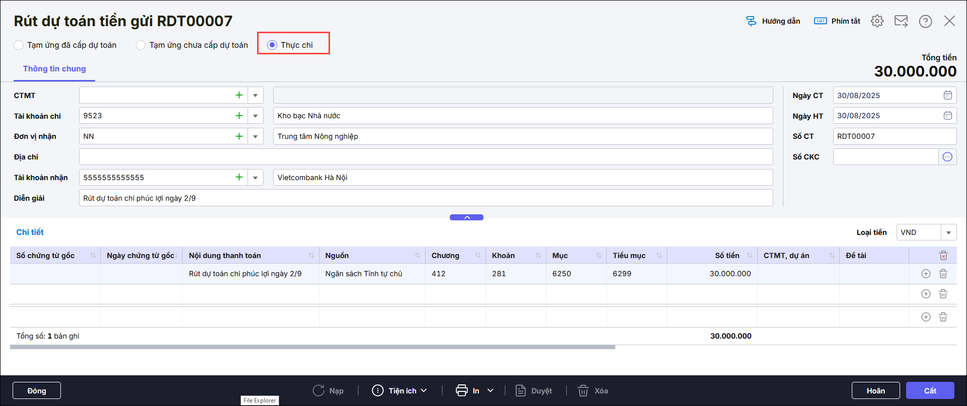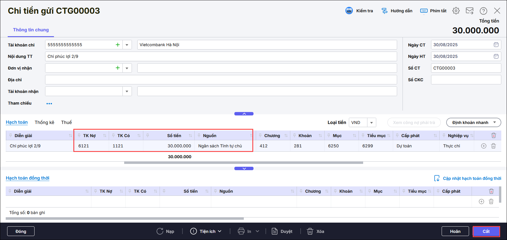- Hạch toán TK Nợ 6121, Có TK 1121, nghiệp vụ Thực chi. Nhấn Cất.