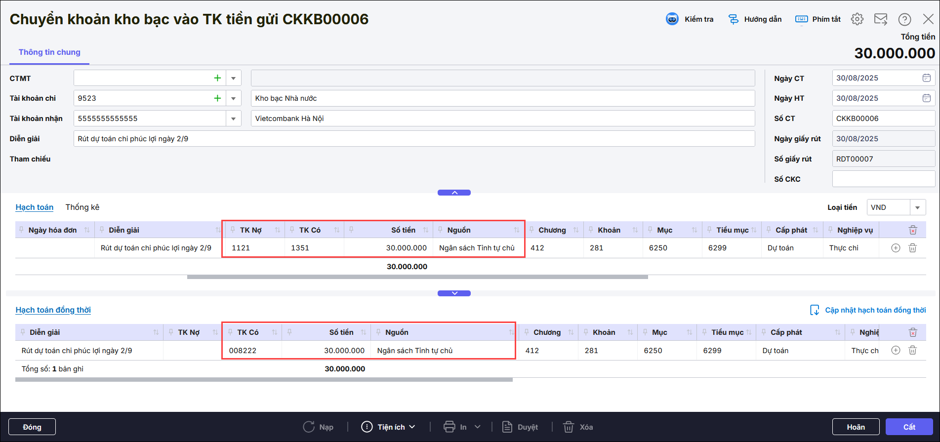 4. Bạn kiểm tra các thông tin trên chứng từ Chuyển khoản kho bạc vào TK tiền gửi, phần mềm đã tự sinh hạch toán Nợ TK 1121, Có TK 1351 – Nghiệp vụ Thực chi, dựa theo tính chất nguồn kinh phí, đồng thời Có TK 008222 tương ứng.