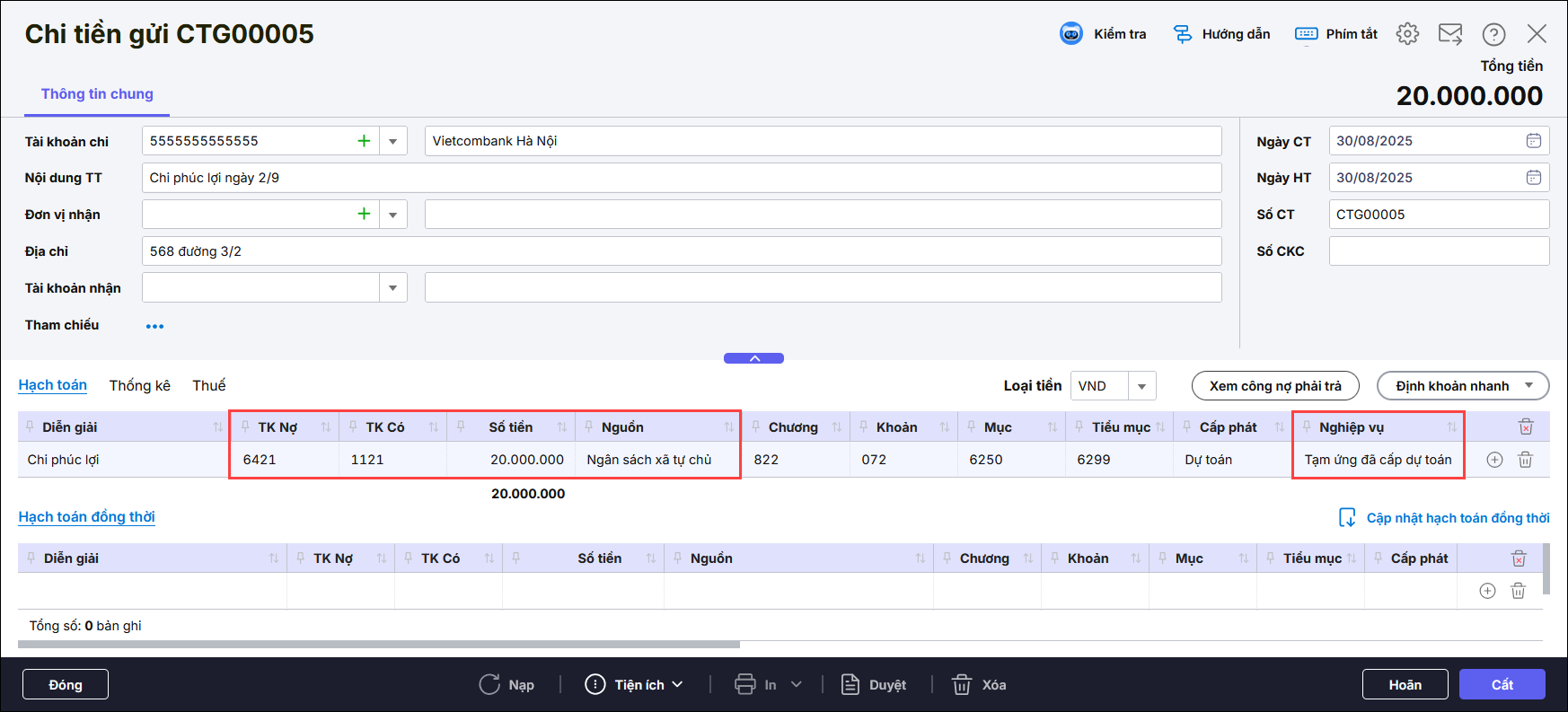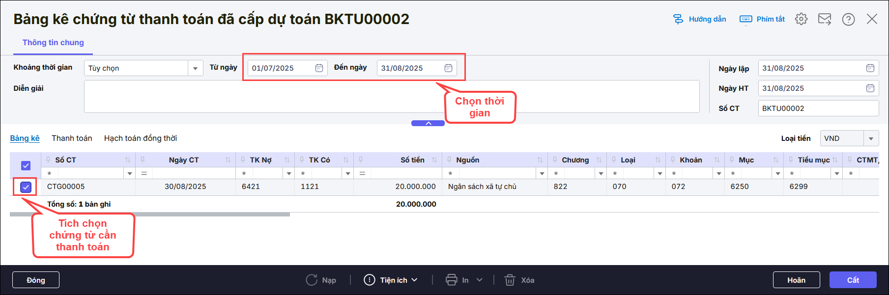 Lưu ý: Nghiệp vụ tích chọn Tạm ứng đã cấp dự toán