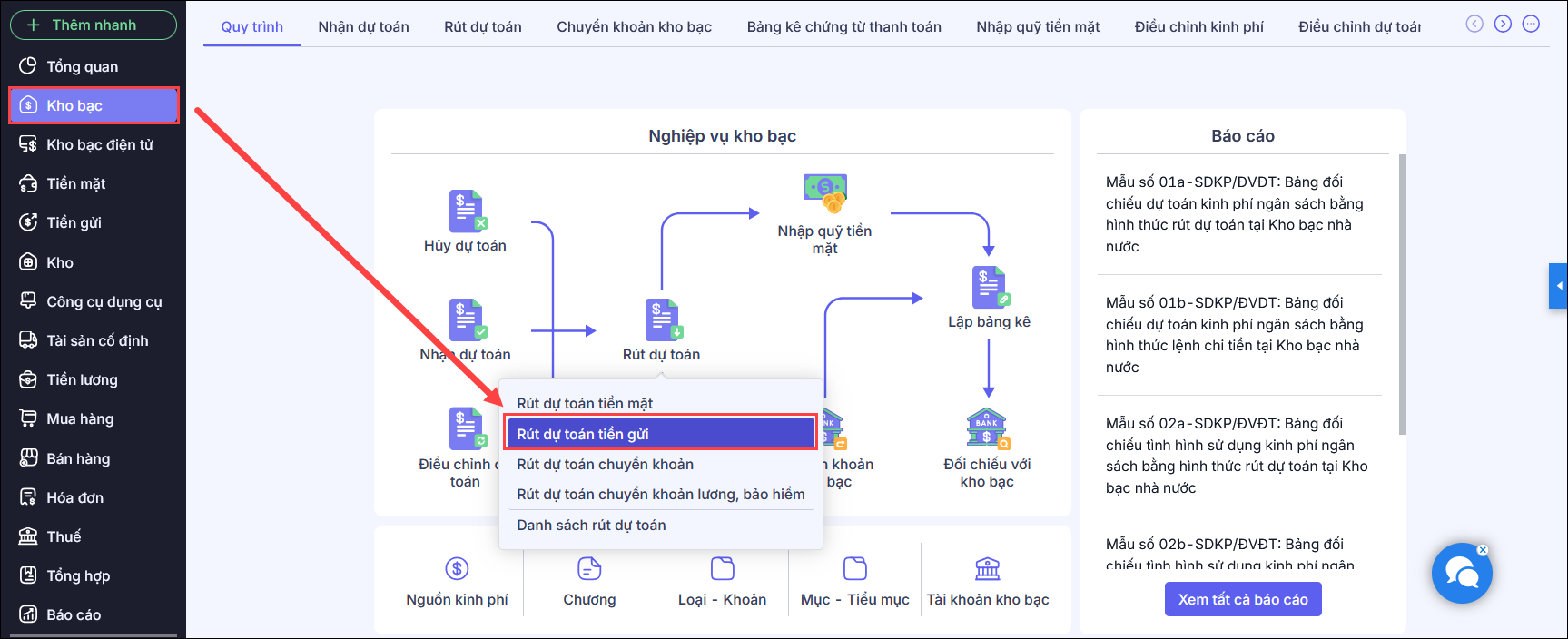 - Vào nghiệp vụ Kho bạc, chọn Rút dự toán, chọn Rút dự toán tiền gửi