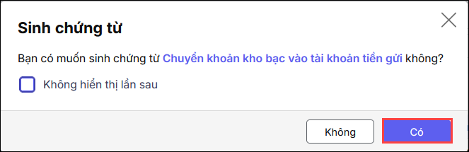 - Nhấn Cất. Hệ thống hiển thị màn hình thông báo sinh chứng từ Chuyển khoản kho bạc vào tài khoản tiền gửi. Nhấn Có.