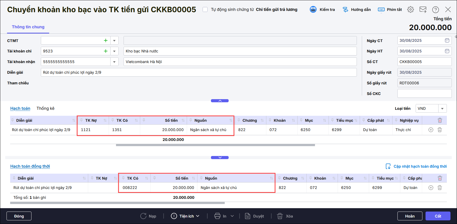 - Anh/ chị kiểm tra các thông tin trên chứng từ Chuyển khoản kho bạc vào TK tiền gửi, phần mềm đã tự sinh hạch toán Nợ TK 1121, Có TK 1351 – Nghiệp vụ Thực chi, dựa theo tính chất nguồn kinh phí, đồng thời Có TK 008222 tương ứng.