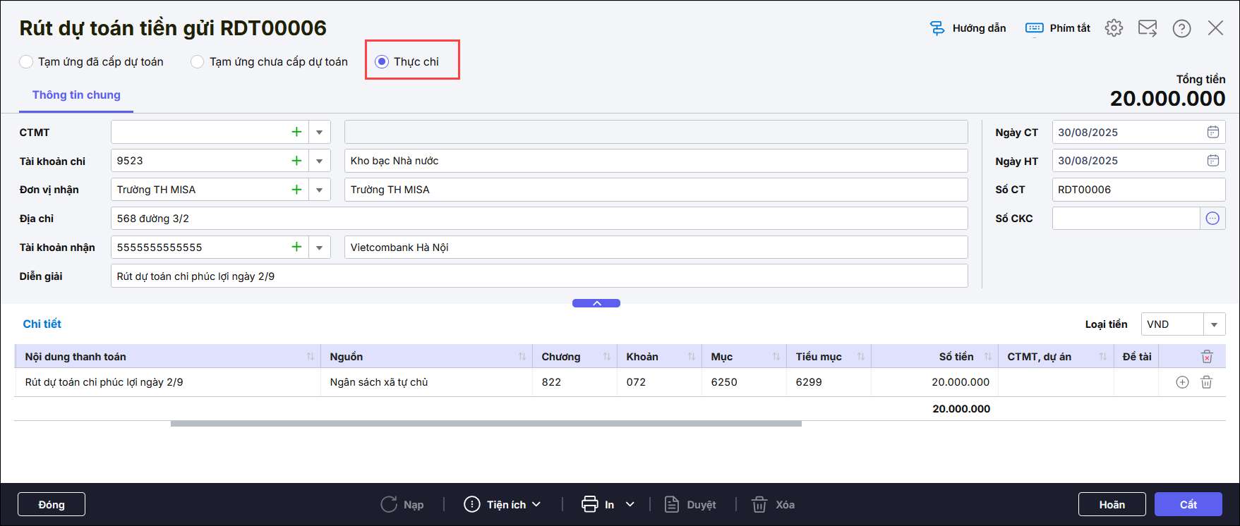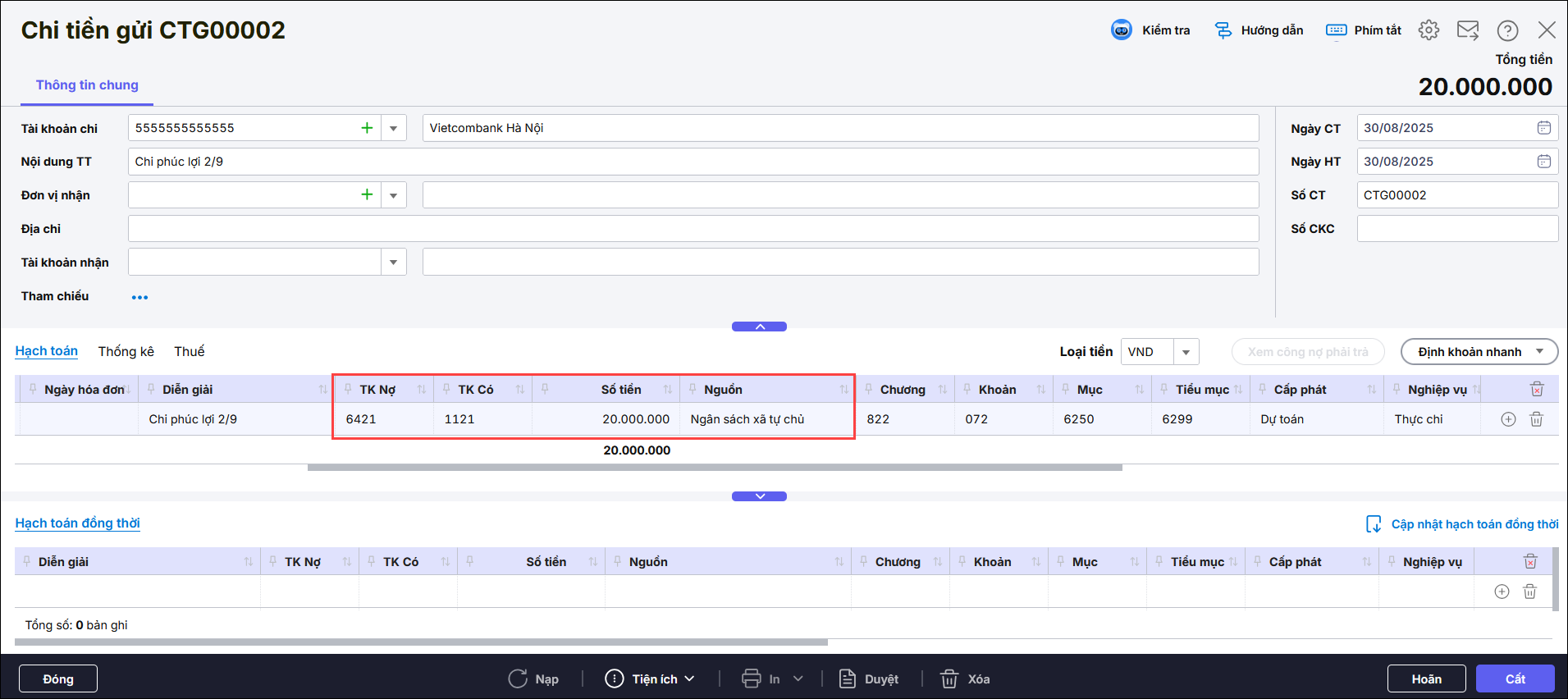 - Hạch toán TK Nợ 6421/Có TK 1121, chọn Nguồn, nhập số tiền, nghiệp vụ là Thực chi
