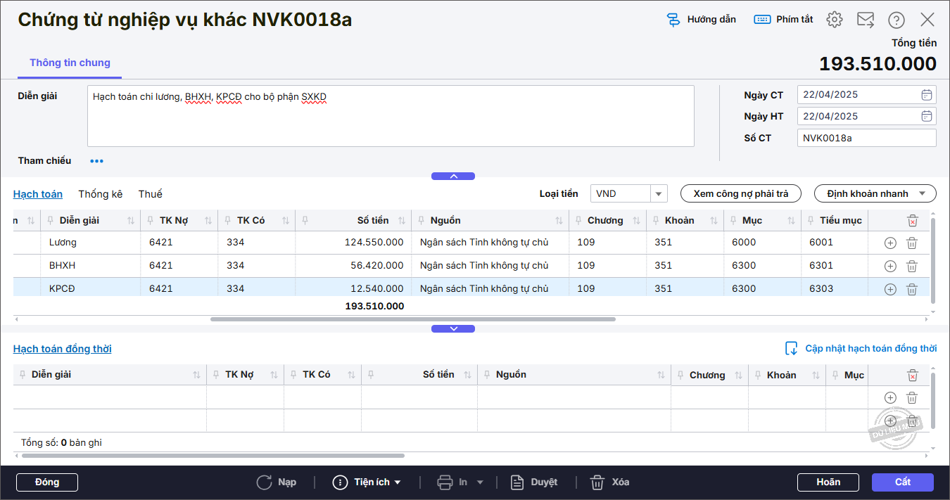– Đơn vị hạch toán chi phí tiền lương, bảo hiểm, kinh phí công đoàn của bộ phận SXKD: 196.000.000 đồng.