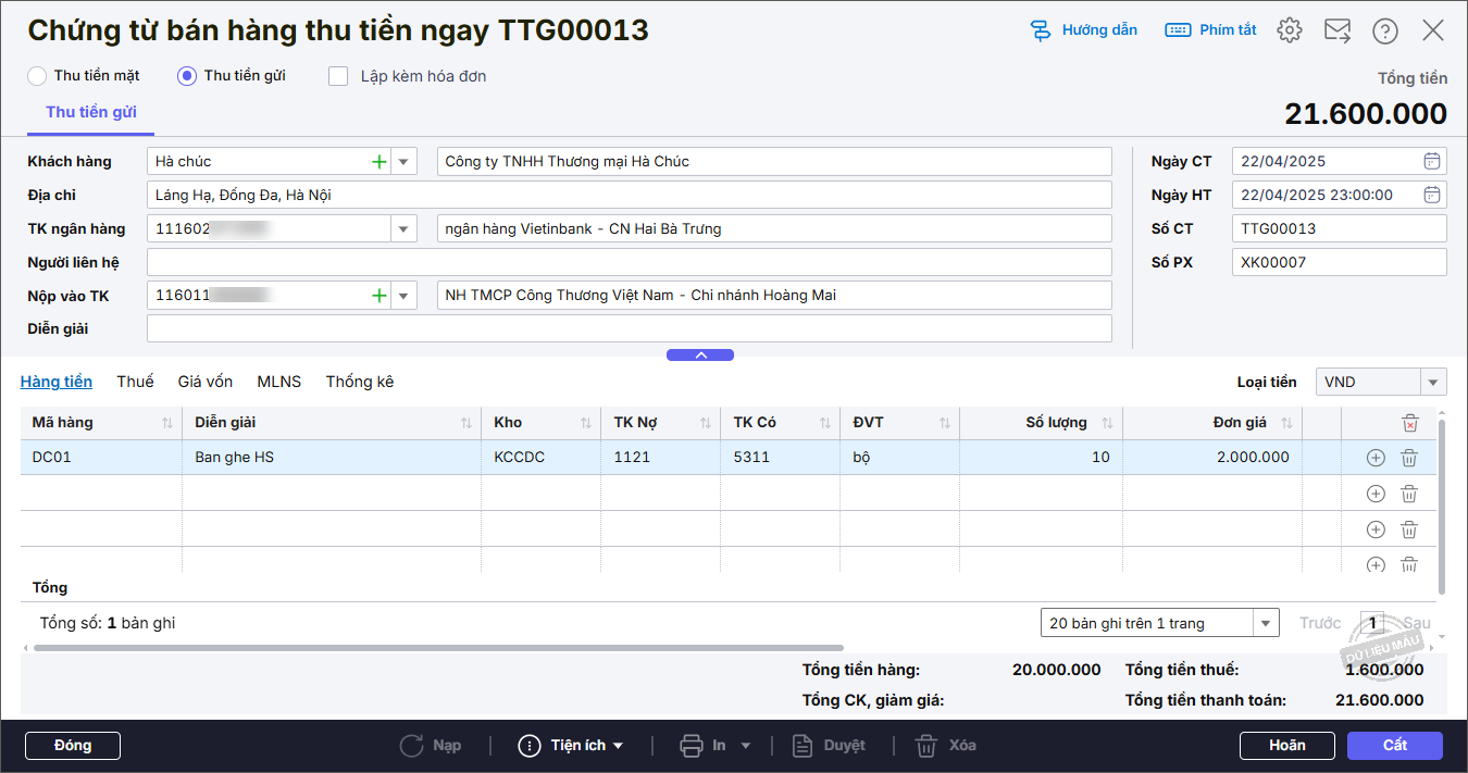 – Đơn vị thu tiền bán bàn ghế qua tài khoản tiền gửi: 21.600.000 đồng.