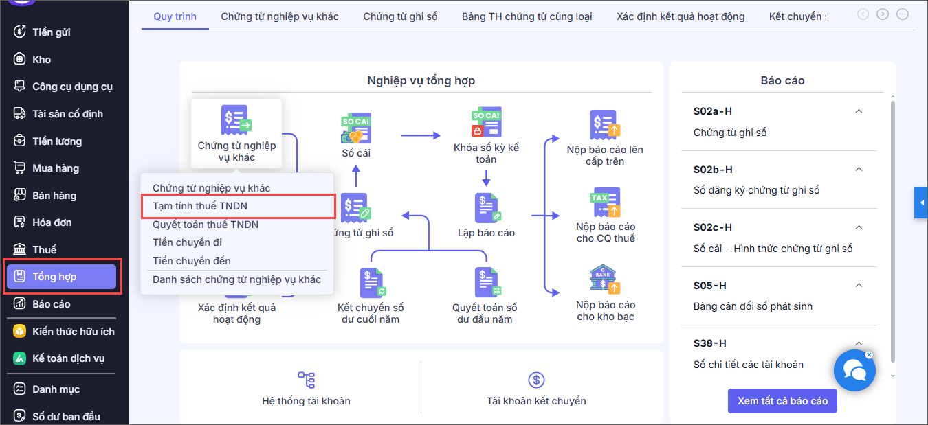 Bước 1: Vào nghiệp vụ Tổng hợp/Chứng từ nghiệp vụ khác/Tạm tính thuế TNDN.