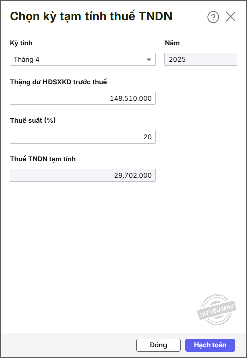Bước 4: Nhấn Hạch toán. Phần mềm lấy lên 1 số thông tin thuế TNDN tạm tính: Kỳ tính, Thuế TNDN tạm tính, thông tin Chứng từ. Anh/chị nhập thêm Diễn giải.