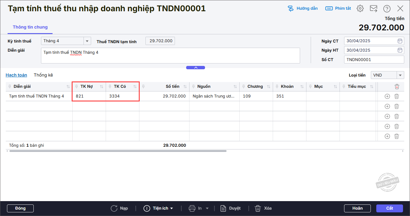 Bước 5: Đồng thời, phần mềm mặc định TK Nợ 821, TK Có 3334, Số tiền được tính bằng số thuế TNDN tạm tính.
