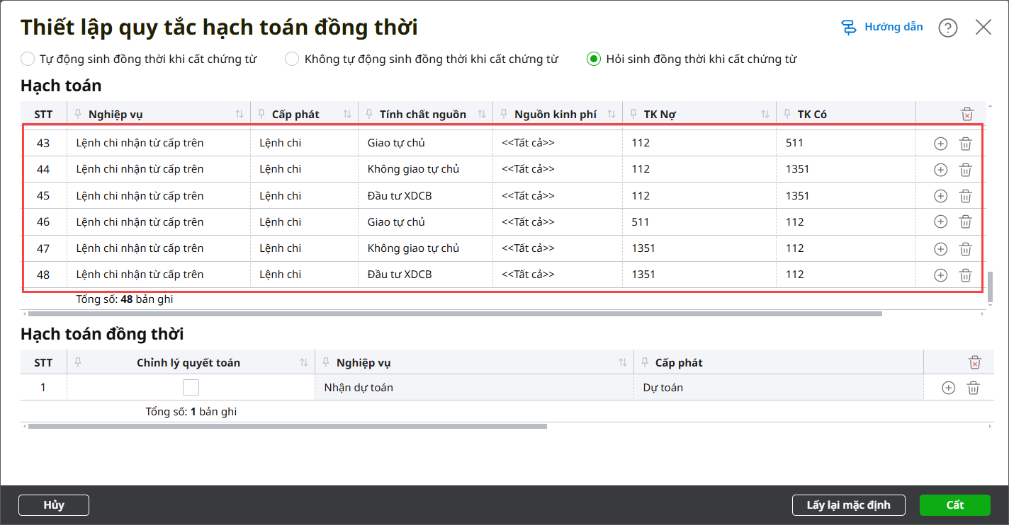 b. Phần mềm cập nhật lại bảng Thiết lập quy tắc hạch toán đồng thời: