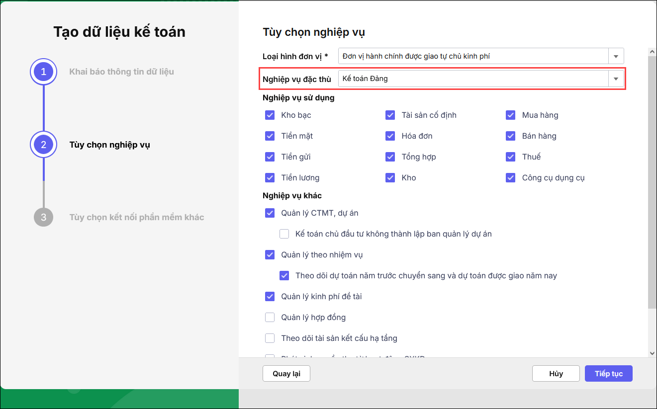 Trường hợp 2: Đơn vị chưa có dữ liệu đặc thù Văn phòng TW Đảng trên MISA Mimosa OnlineĐối với đơn vị chưa có dữ liệu đặc thù Văn phòng TW Đảng trên Mimosa Online, bạn cần phải tạo dữ liệu kế toán mới theo hướng dẫn tại đây. Tại mục 2 Tùy chọn nghiệp vụ:
