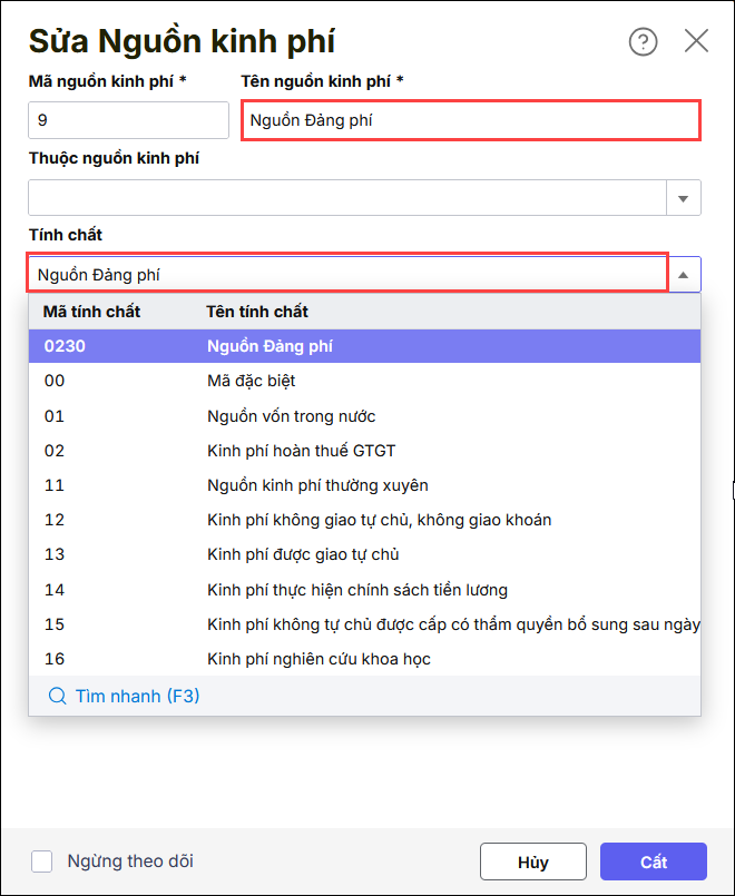 d. Phần mềm bổ sung thêm Nguồn kinh phí 09 “Nguồn Đảng phí” và Tính chất nguồn kinh phí 0230 “Nguồn đảng phí”.