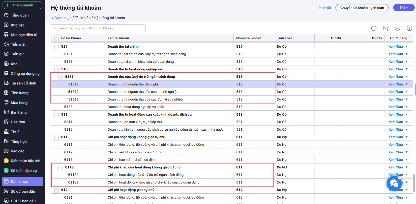 2.2. Các thông tin được cập nhậta. Phần mềm bổ sung các tài khoản đặc thù Văn phòng TW Đảng tại Danh mục\Hệ thống tài khoản: