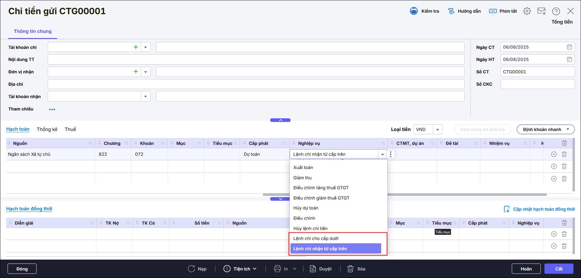 c. Phần mềm bổ sung thêm 2 loại Nghiệp vụ trên các chứng từ gồm: Lệnh chi cấp cho cấp dưới, Lệnh chi nhận từ cấp trên.
