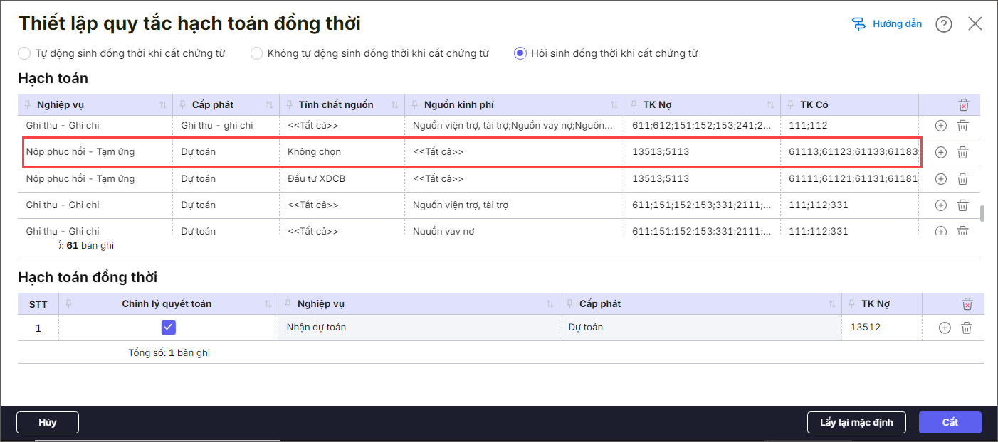 4. [TCTK] Cập nhật quy tắc sinh hạch toán đồng thời cho nghiệp vụ Nộp phục hồi – Thực chi/Tạm ứng