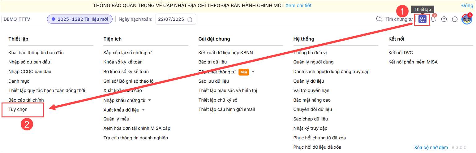 1. Vào Bánh răng \Thiết lập\Tùy chọn.