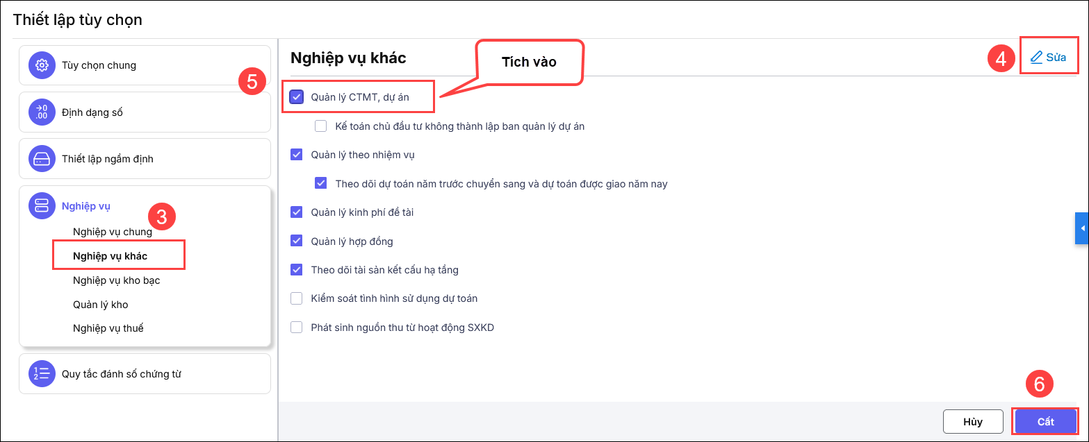 3. Tích chọn Quản lý CTMT, DA. Nhấn Cất.
