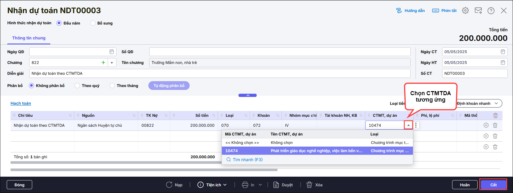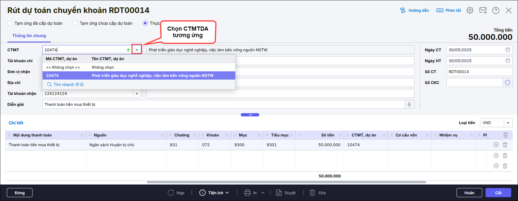 Bước 2: Chọn CTMT, DA trên chứng từ
