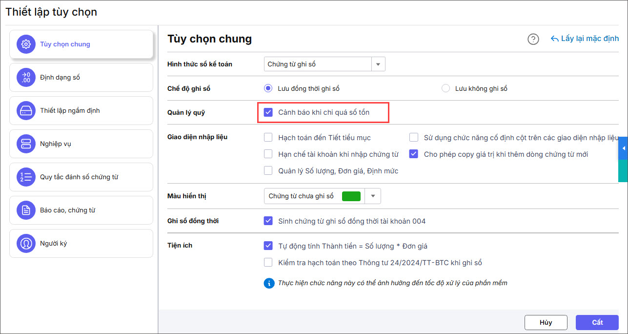Bước 3: Tích chọn vào ô Cảnh báo khi chi quá số tồn. Nhấn Cất.