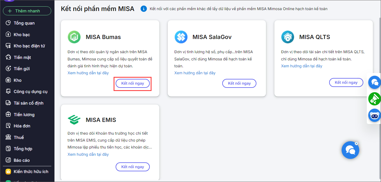 Bước 2: Tại biểu tượng MISA Bumas, chọn Kết nối ngay.