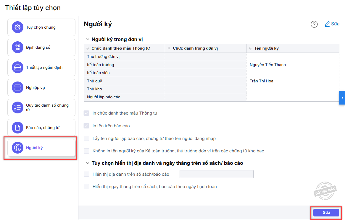 Bước 2: Chọn tab Người ký. Nhấn Sửa.