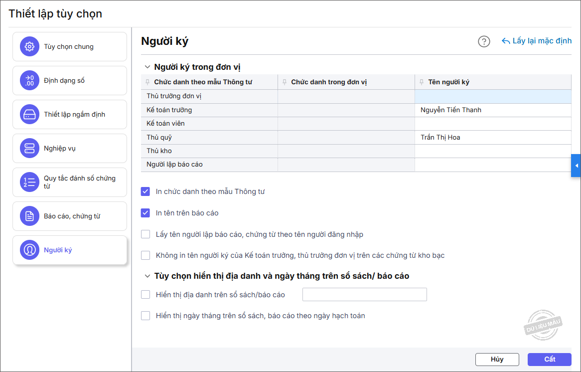 Bài viết này hướng dẫn anh/chị cách thay đổi thông tin người lập, kế toán, thủ trưởng đơn vị, cùng với địa danh và ngày tháng trên sổ sách, báo cáo, giúp đảm bảo các thông tin hiển thị đúng và đầy đủ khi có sự thay đổi trong đơn vị.