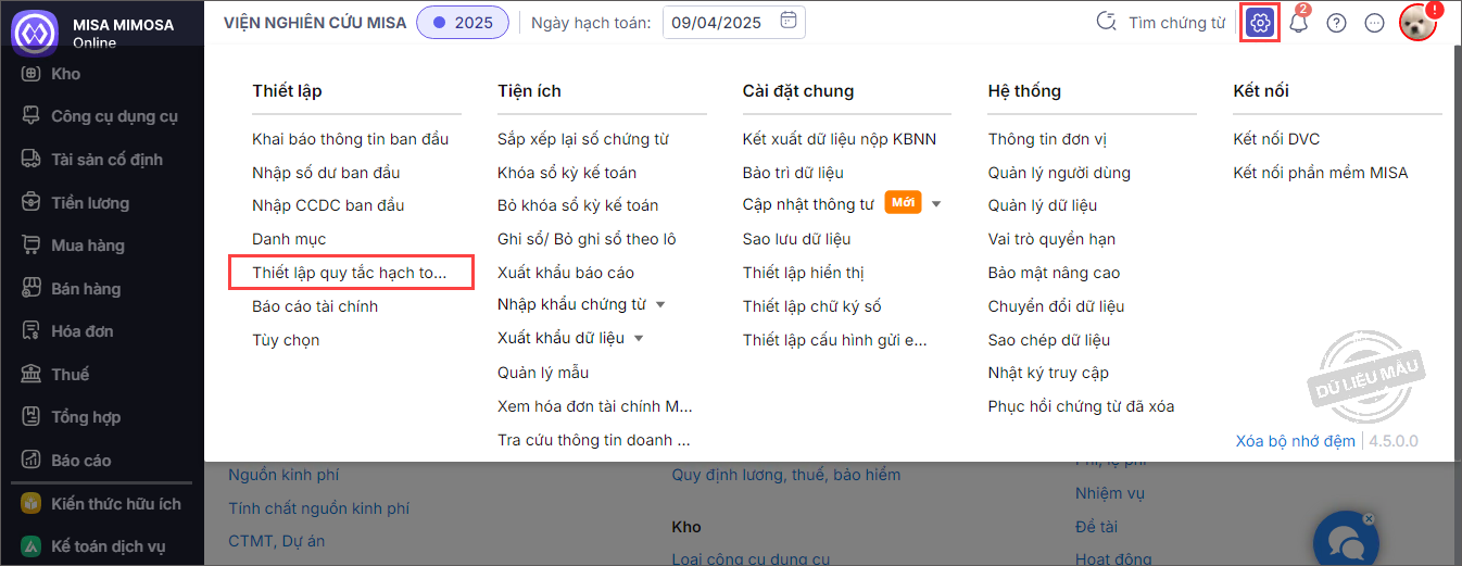 Bước 1: Vào biểu tượng Bánh răng ⚙ (góc phải phía trên)\ Thiết lập\ Thiết lập quy tắc hạch toán đồng thời.