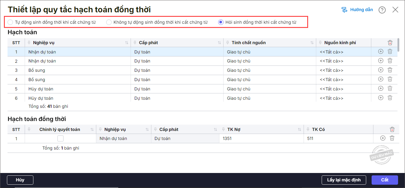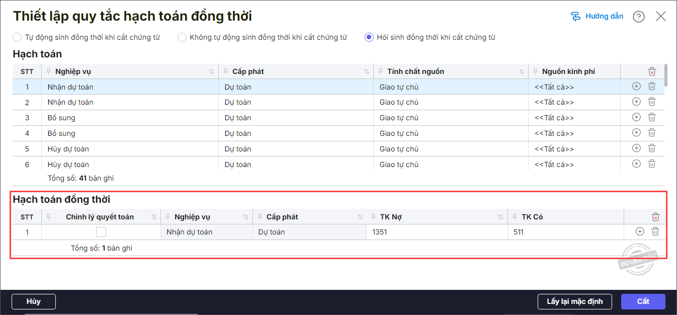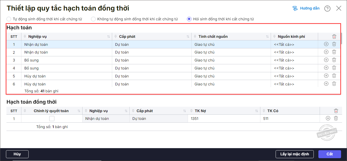 Bước 5: Trường hợp anh/chị muốn lấy lại danh sách các nghiệp vụ hạch toán đồng thời mà phần mềm mặc định mang đi, nhấn Lấy lại mặc định.
