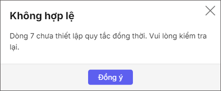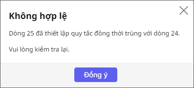 • Trường hợp thiết lập thêm quy tắc trùng với quy tắc đã có, phần mềm hiển thị cảnh báo, anh/chị nhấn Đồng ý và xóa dòng vừa thêm hoặc có thể sửa luôn trên dòng phần mềm báo đã có.