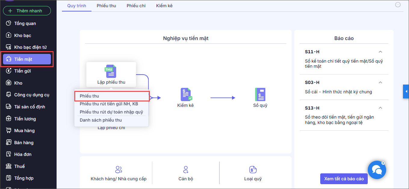 Bước 1. Vào nghiệp vụ Tiền mặt, chọn Lập phiếu thu\Phiếu thu.