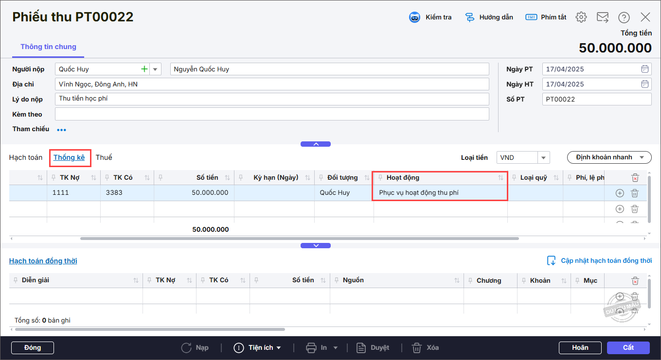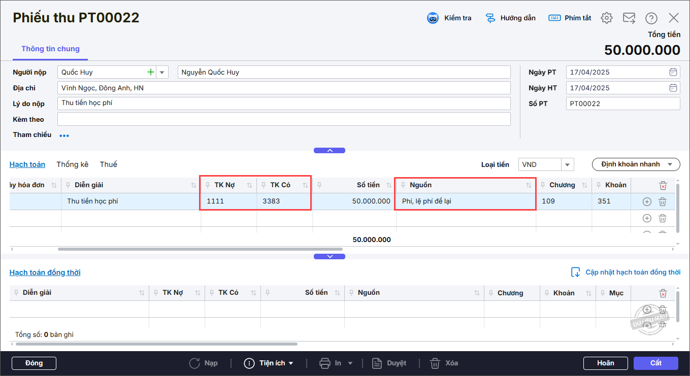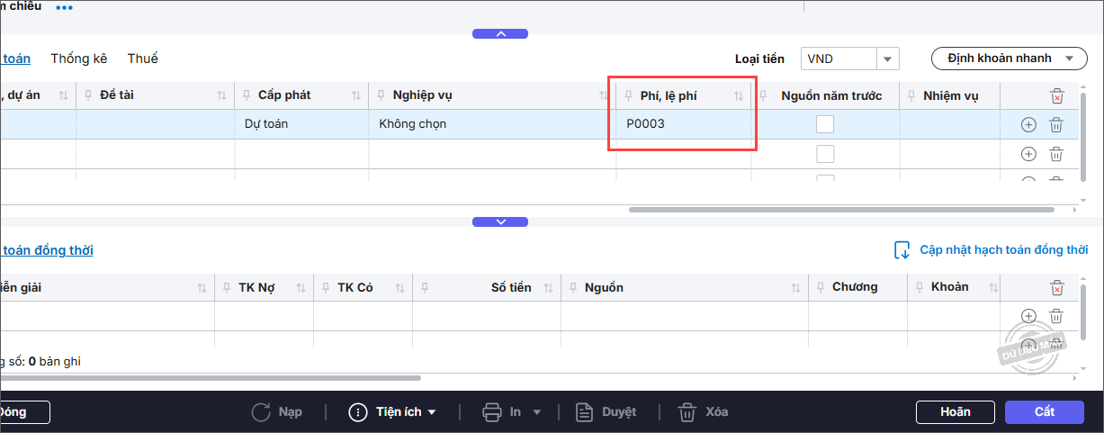 - Chọn thông tin Phí, lệ phí cho dòng hạch toán đã nhập. Sau đó nhấn Cất.
