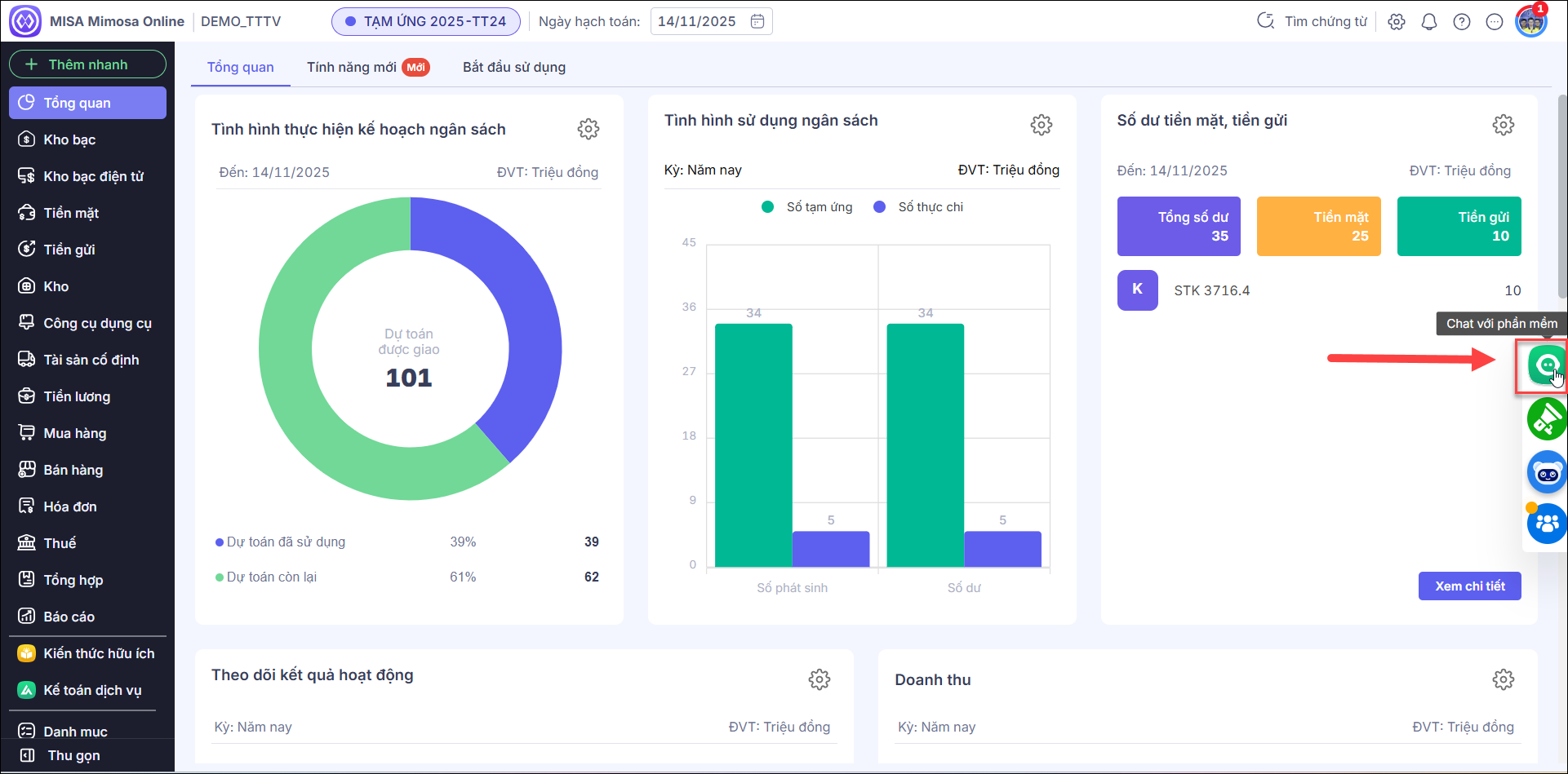 Bước 1: Sau khi đăng nhập vào phần mềm, anh/chị nhấn vào dấu mũi tên ⏴bên mép bên phải, nhấn chọn biểu tượng ? Chat với phần mềm