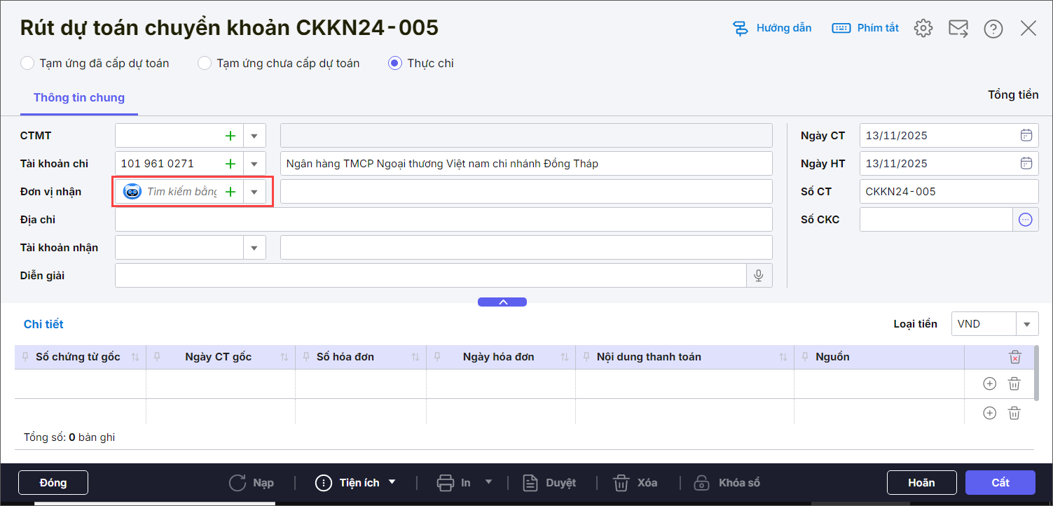 *Tạm thời phần mềm chỉ đáp ứng tính năng trên chứng từ Rút dự toán chuyển khoản.