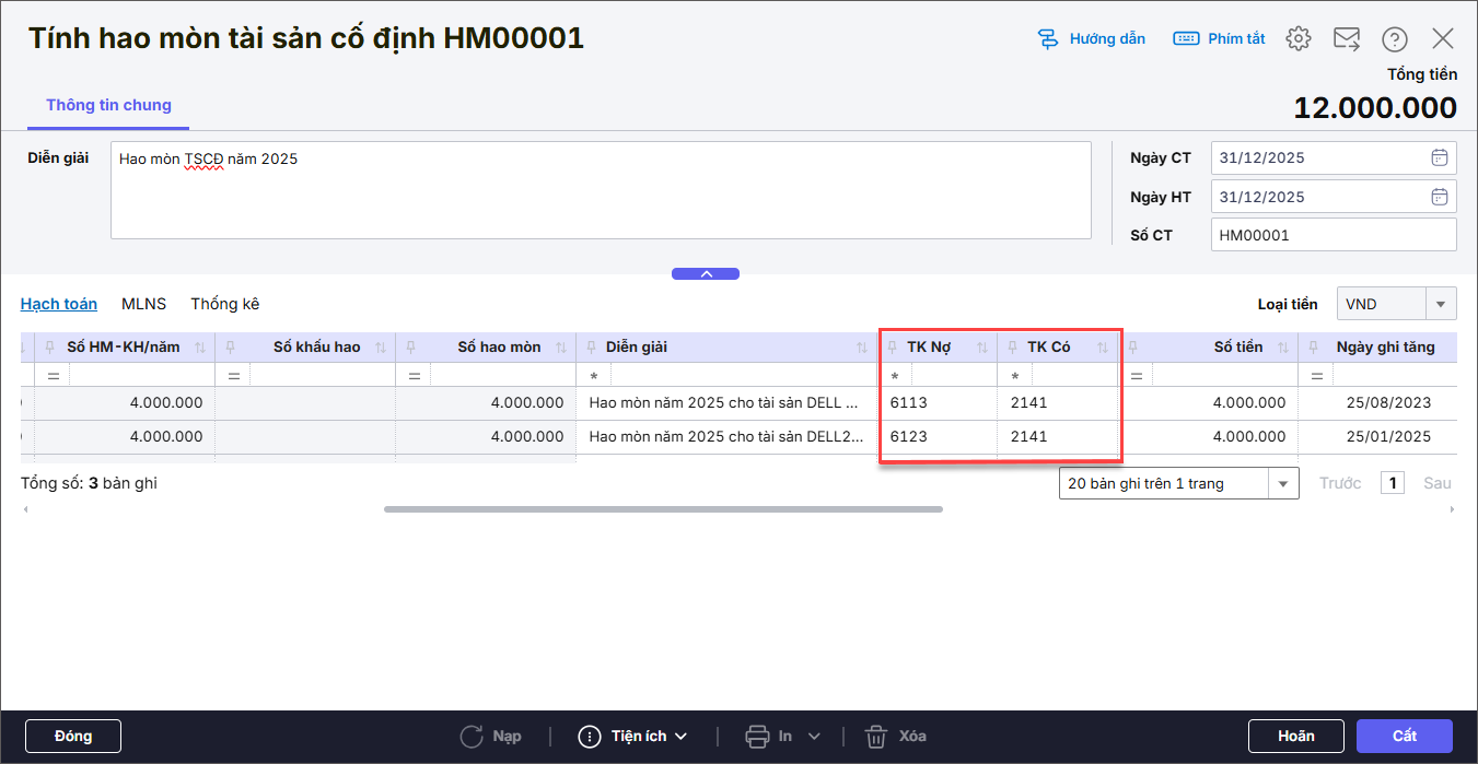 Bước 2. Kiểm tra lại thông tin trên chứng từ Hao mòn tài sản cố định theo phần Định khoản ở trên.