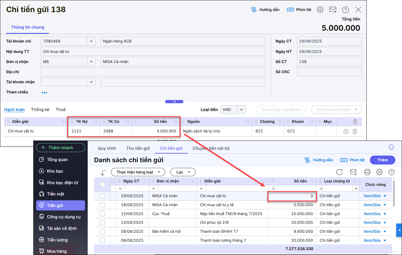 • Với chứng từ Chi tiền gửi, lẽ ra phải hạch toán Có TK 112 (vì tiền gửi đang giảm). Tuy nhiên, nếu kế toán hạch toán nhầm Nợ TK 112, phần mềm sẽ hiểu là nghiệp vụ tăng tiền gửi, dẫn đến tổng tiền chứng từ hiển thị bằng 0.