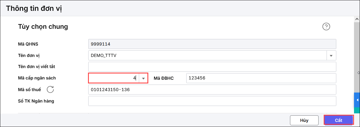 Bước 2: Vào biểu tượng Bánh răng ⚙️(góc phải phía trên)\Hệ thống\Thông tin đơn vị, kiểm tra Mã cấp ngân sách đã nhập đúng chưa, nếu chưa thì nhấn Sửa để sửa rồi nhấn Cất.