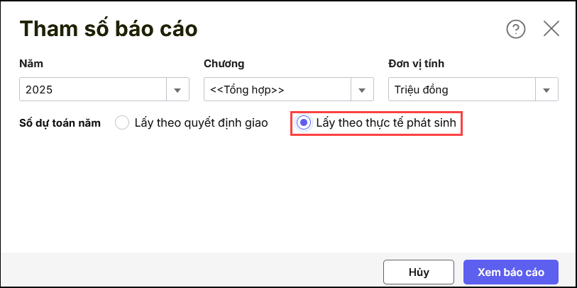 Nguyên nhân: Khi in báo cáo, không hiển thị số liệu là do anh/chị chưa tích chọn “Số dự toán năm lấy theo thực tế phát sinh” trong phần tham số báo cáo.