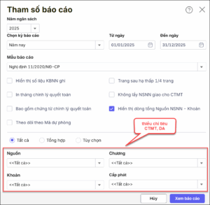 • Tại màn hình Tham số báo cáo không hiển thị đủ chỉ tiêu để chọn (như CTMT, Dự án, Loại kinh phí,…).
