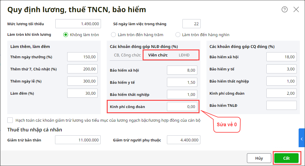 Bước 2: Tại bảng Quy định lương, thuế TNCN, bảo hiểm, Tích chọn lần lượt vào các tab CB, Công chức/ Viên chức/ LĐHĐ sửa lại Tỷ lệ Kinh phí công đoàn trừ vào lương về 0, sau đó nhấn Cất.