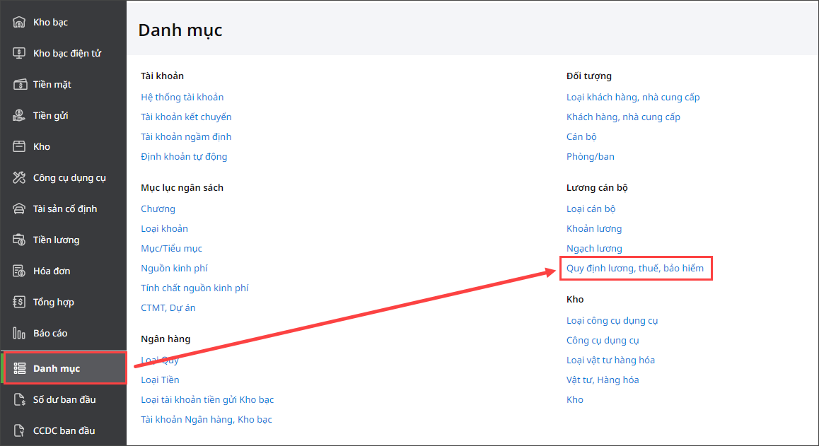 Bước 1: Vào Danh mục\chọn Quy định lương, thuế, bảo hiểm.