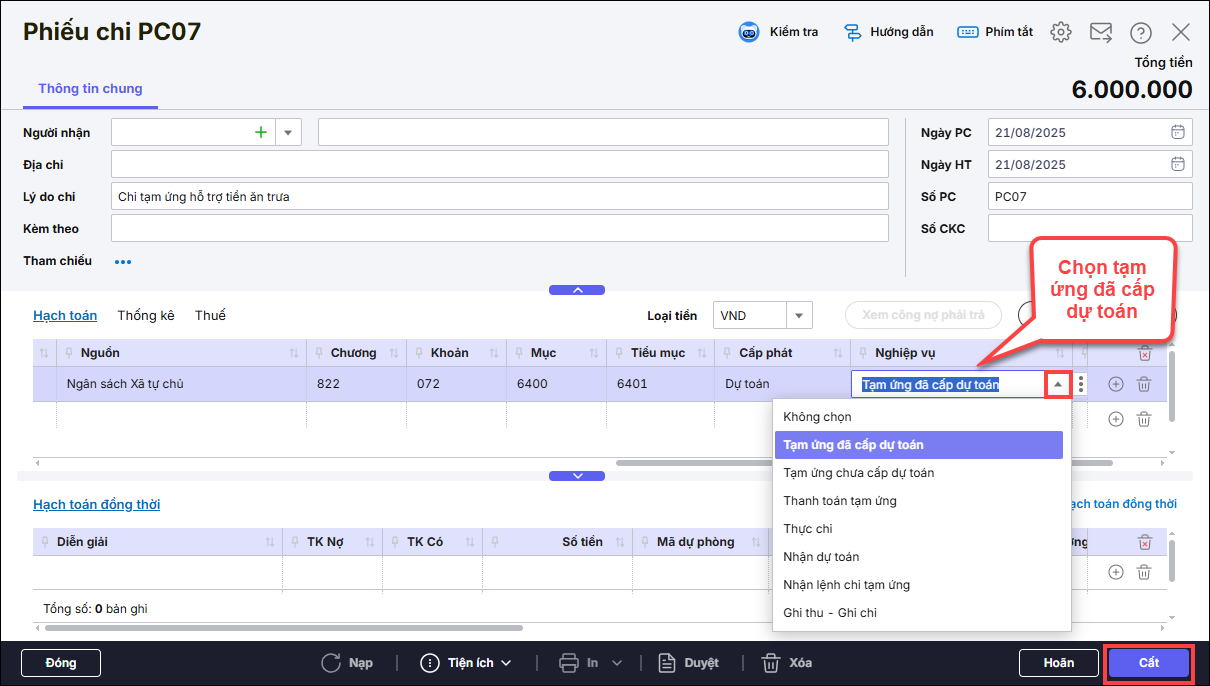 Nguyên nhân 2: Chưa có chứng từ chi tiền tạm ứngGiải pháp: Anh/chị thực hiện lập phiếu chi tiền tạm ứng theo hướng dẫn tại đây Nguyên nhân 3: Chứng từ chi tạm ứng không chọn đúng cột Nghiệp vụ là Tạm ứng đã cấp dự toánGiải pháp: Anh/chị kiểm tra chứng từ chi tiền tạm ứng, chọn đúng cột Nghiệp vụ là Tạm ứng đã cấp dự toán