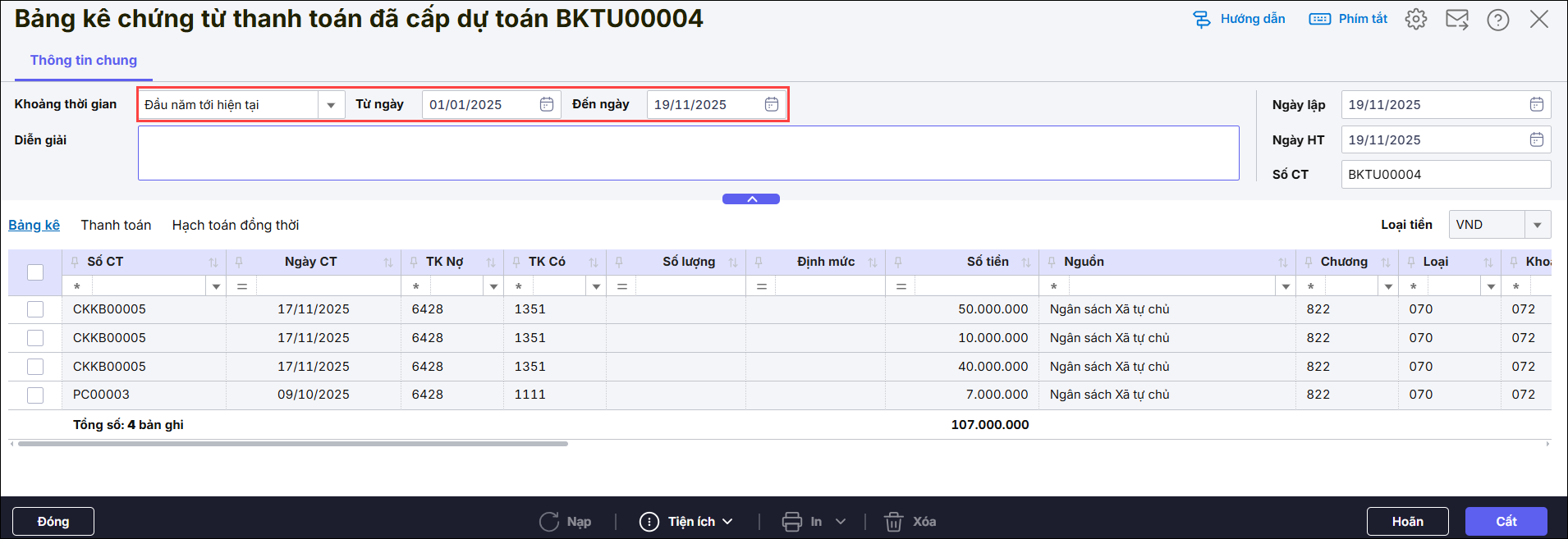 Nguyên nhân 1: Chứng từ nằm ngoài thời gian lập bảng kêVí dụ : Anh/chị có chứng từ chi tạm ứng tháng 10, tháng 11 mới thanh toán . Khi lập bảng kê tháng 11 lại không thấy chứng từ chi , do thời gian lập bảng kê đang chọn khoảng thời gian là tháng 11 Giải pháp: Anh/chị chọn lại thời gian lập bảng kê từ đầu năm đến hiện tại