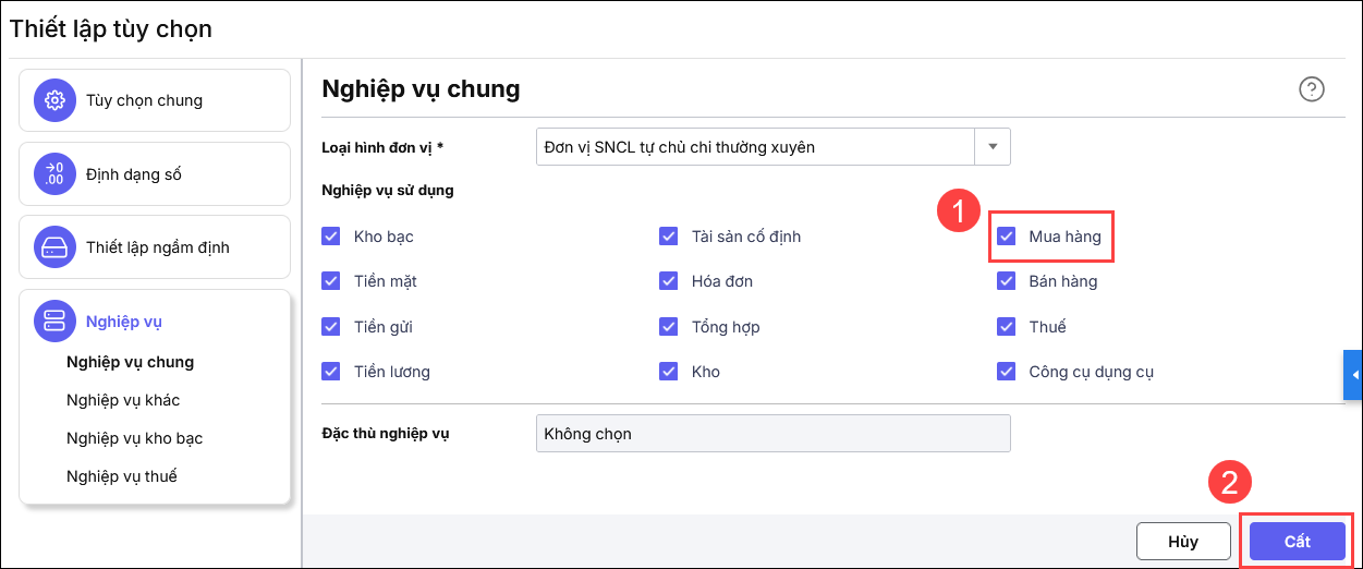 - Vào biểu tượng Bánh răng ⚙ (góc phải phía trên)\Thiết lập\Tùy chọn\Nghiệp vụ\Nghiệp vụ chung.